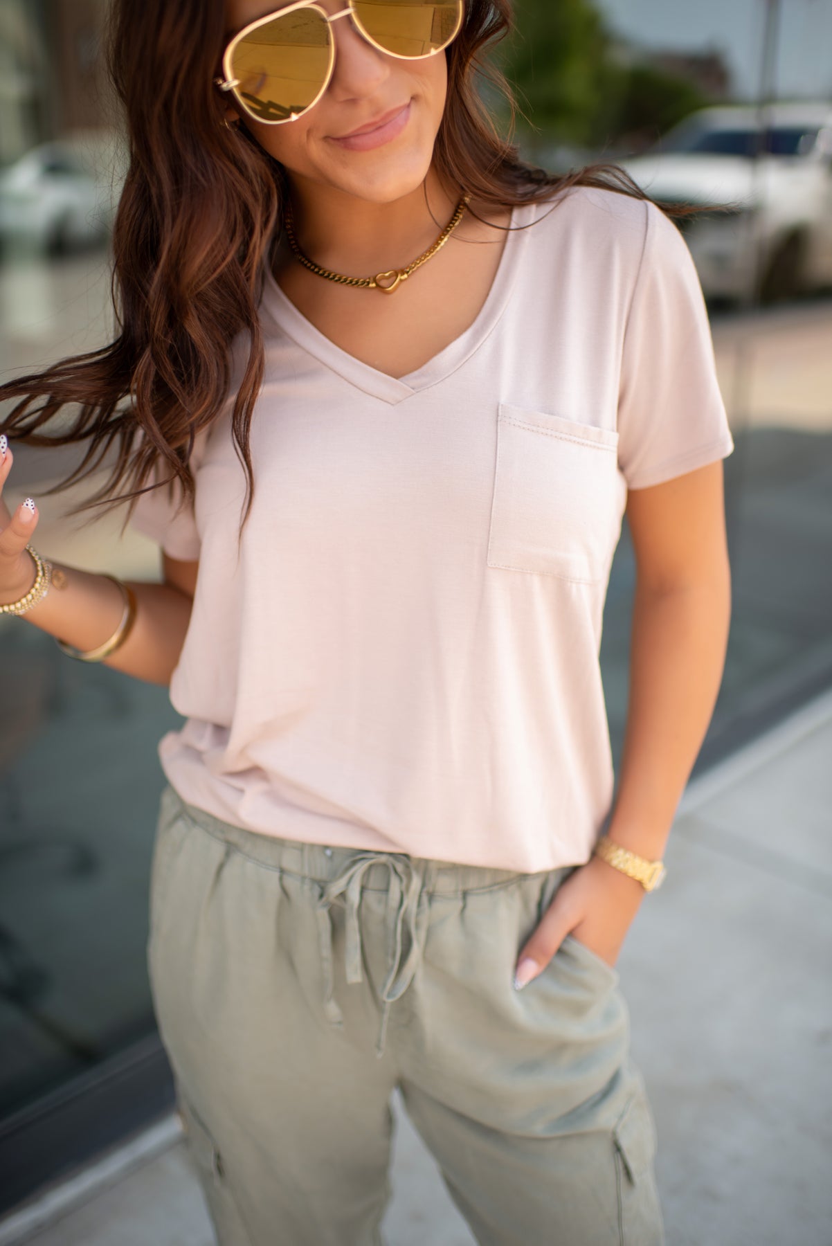 Meet your new favorite tee: the Desert Drift V-Neck Pocket Tee in taupe. This short sleeve top is incredibly soft, stretchy, and flowy—perfect for layering as the seasons change. Its relaxed fit and subtle v-neck make it an easy, stylish basic that’s ready to drift with you into fall adventures.