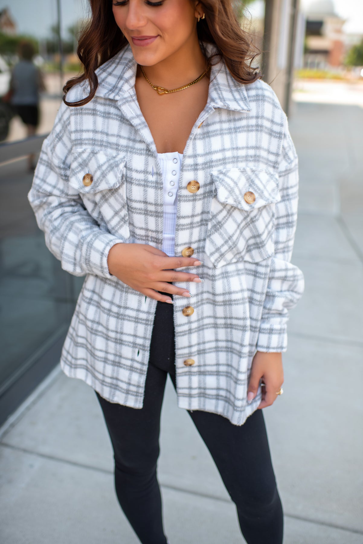 Wrap yourself in cozy charm with the Oakley Plaid Shacket in Heather Grey. This soft, long-sleeve shacket features a classic collared neckline and wood button closures that add rustic flair. Two front pockets with button details keep essentials close, while buttoned cuffs let you adjust your style. Perfect for layering, it’s the playful, comfy piece your wardrobe has been waiting for.