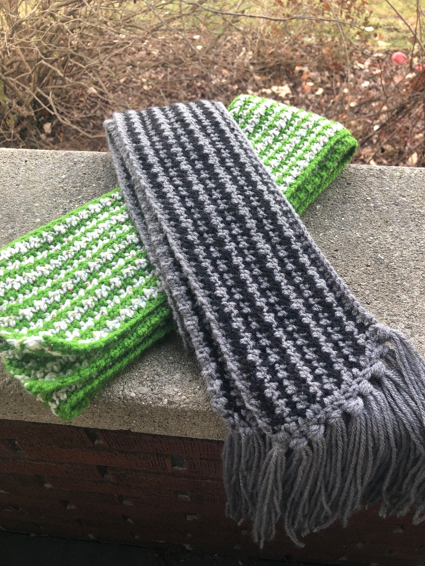 Hand crafted crochet scarves in a variety of styles and patterns. These scarves are made of a cotton acrylic blend.