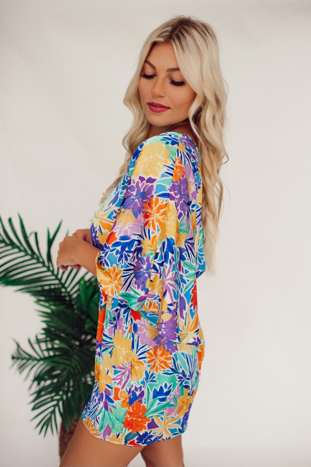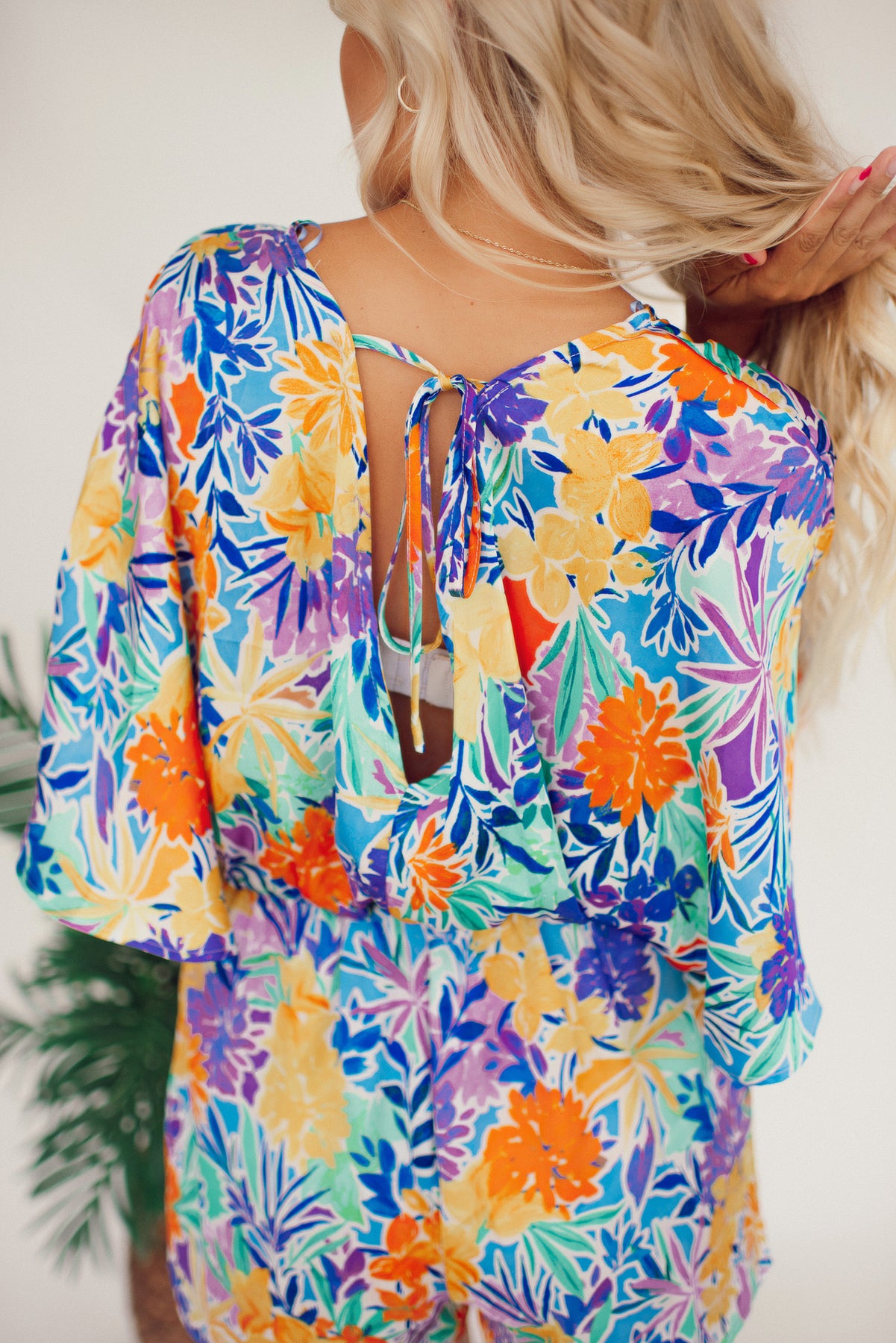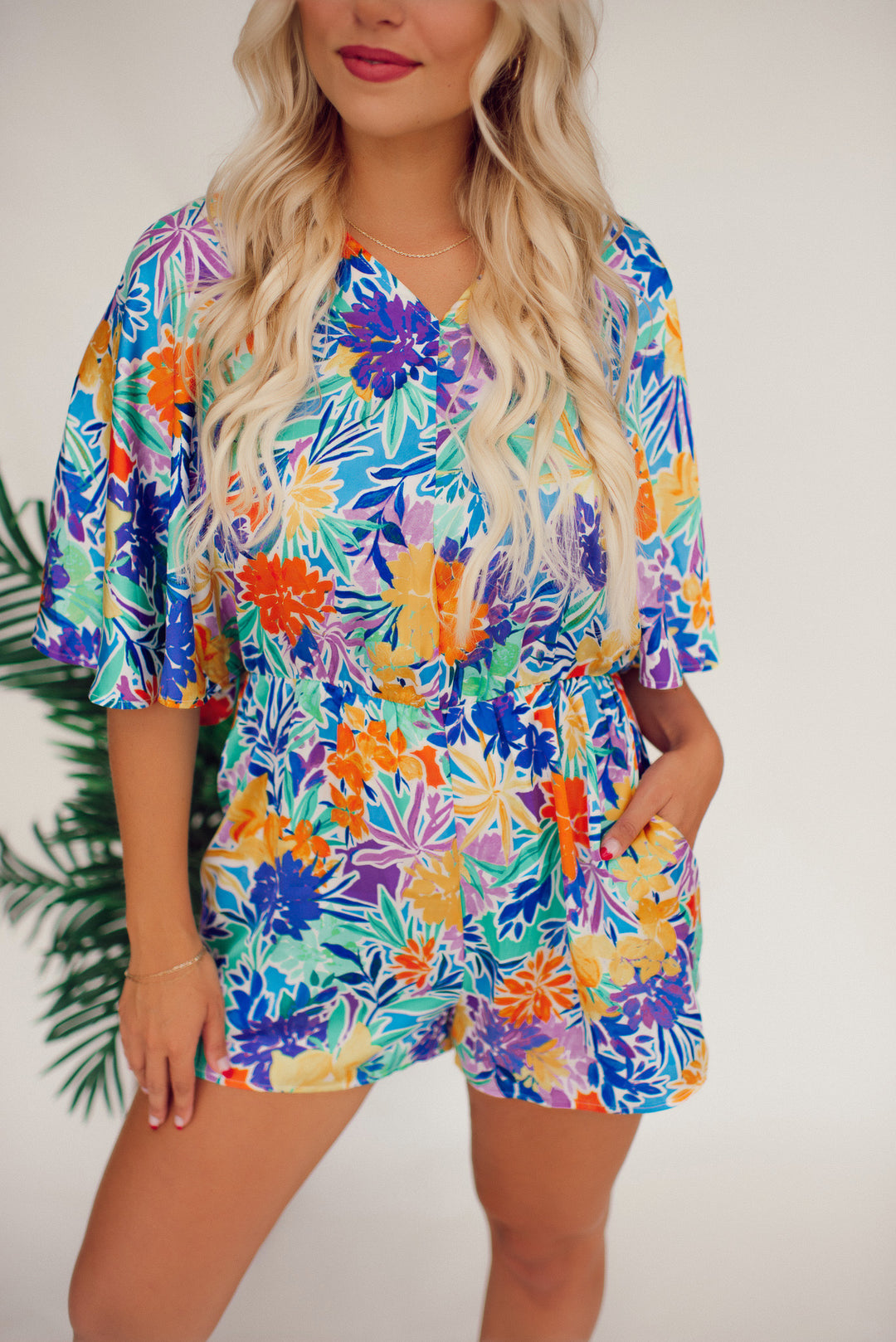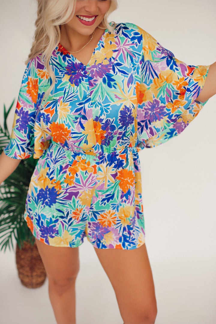 Step into tropical paradise with our 30A Tropic Time Romper! Featuring vibrant tropical print, kimono sleeves, and a back tie detail, this lightweight and breezy romper is a must-have for summer parties and vacations. Don't miss out on the fun, get your hands on this playful look now!