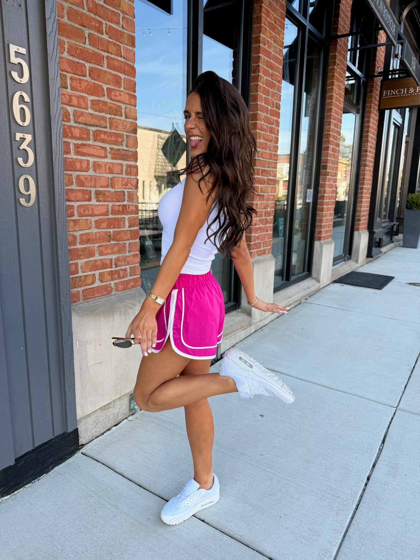Stay light on your feet with the Flex Flow Active Shorts, designed for movement and style. These dolphin active shorts feature a curved hemline for a flattering, sporty silhouette, accented by a bold contrast stripe that adds a pop of energy. The elastic waistband and mesh underwear ensures a secure, comfortable fit whether you're hitting the track or running errands.