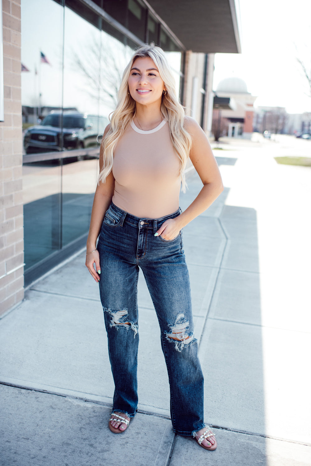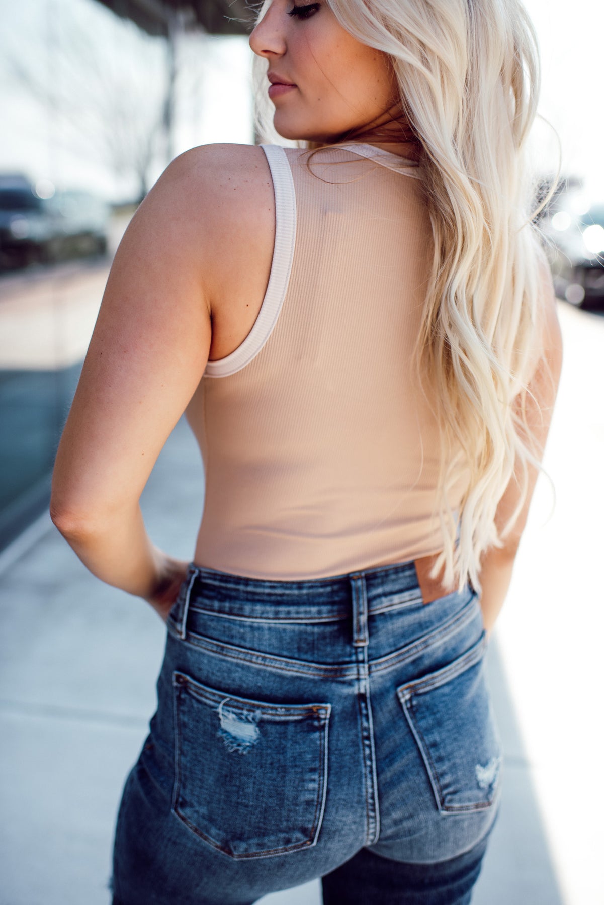We are definitely not over the bodysuit trend! They are the perfect layering pieces and offer that fitted tucked in look without the troubles of constantly adjusting your top! This bodysuit is meant to be fitted to the body, but is made from a stretchy ribbed knit fabric! We love the thick shoulder straps, high neckline, and trendy colored seams. Thong style so no panty lines!