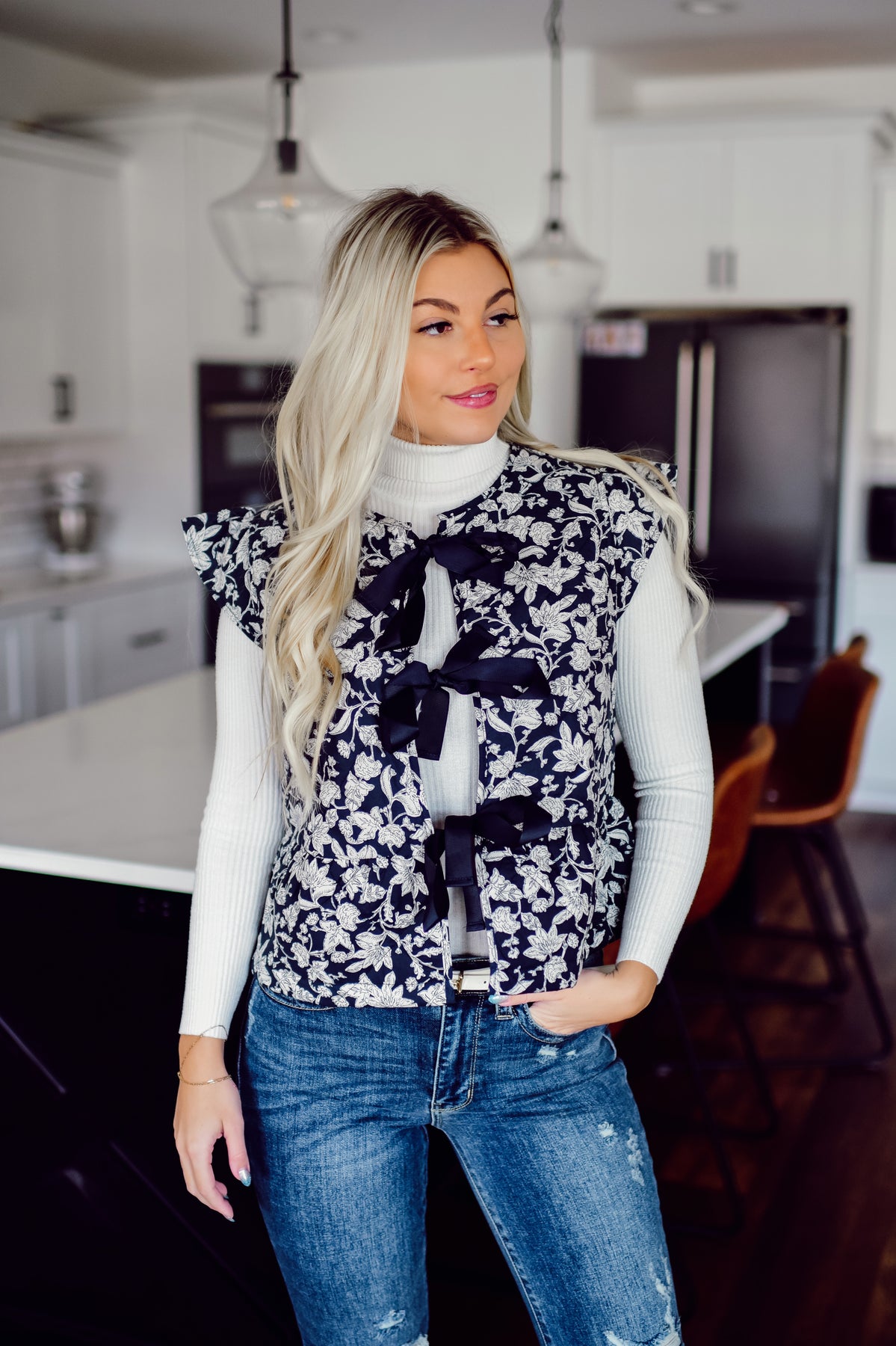 Discover instant charm with the Quilted Gardens Floral Vest! This delightful piece features a quilted navy and cream floral design with a round neckline and open front secured by three cream ribbon bows. Flutter sleeves and a peplum flared hem create a playful, feminine silhouette that works beautifully over dresses, blouses, or tees.