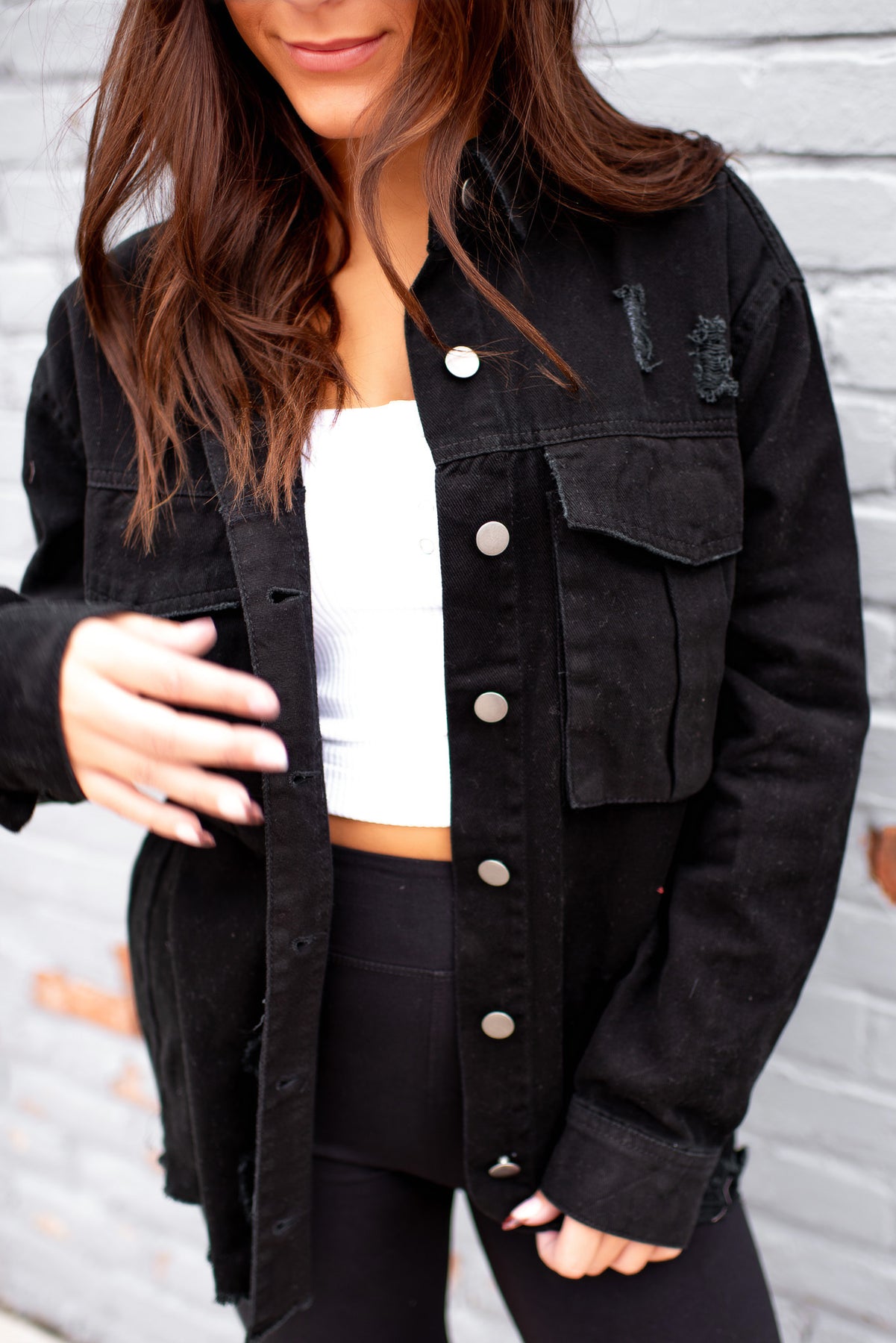 Sienna Distressed Denim Jacket in Dark Mauve brings oversized comfort with a playful edge. Long sleeves and a classic collar frame a button-down front, while two front pockets add a handy touch. Perfect for layering up and adding a cool, casual vibe to any outfit!