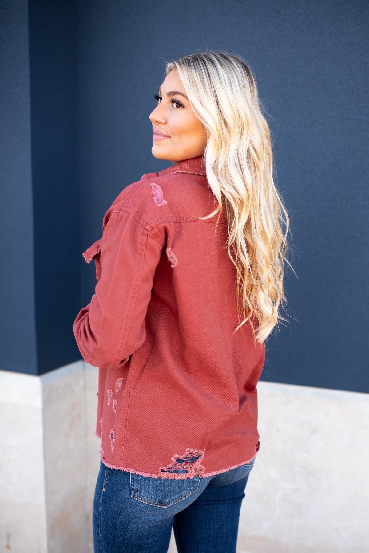 Sienna Distressed Denim Jacket in Dark Mauve brings oversized comfort with a playful edge. Long sleeves and a classic collar frame a button-down front, while two front pockets add a handy touch. Perfect for layering up and adding a cool, casual vibe to any outfit!