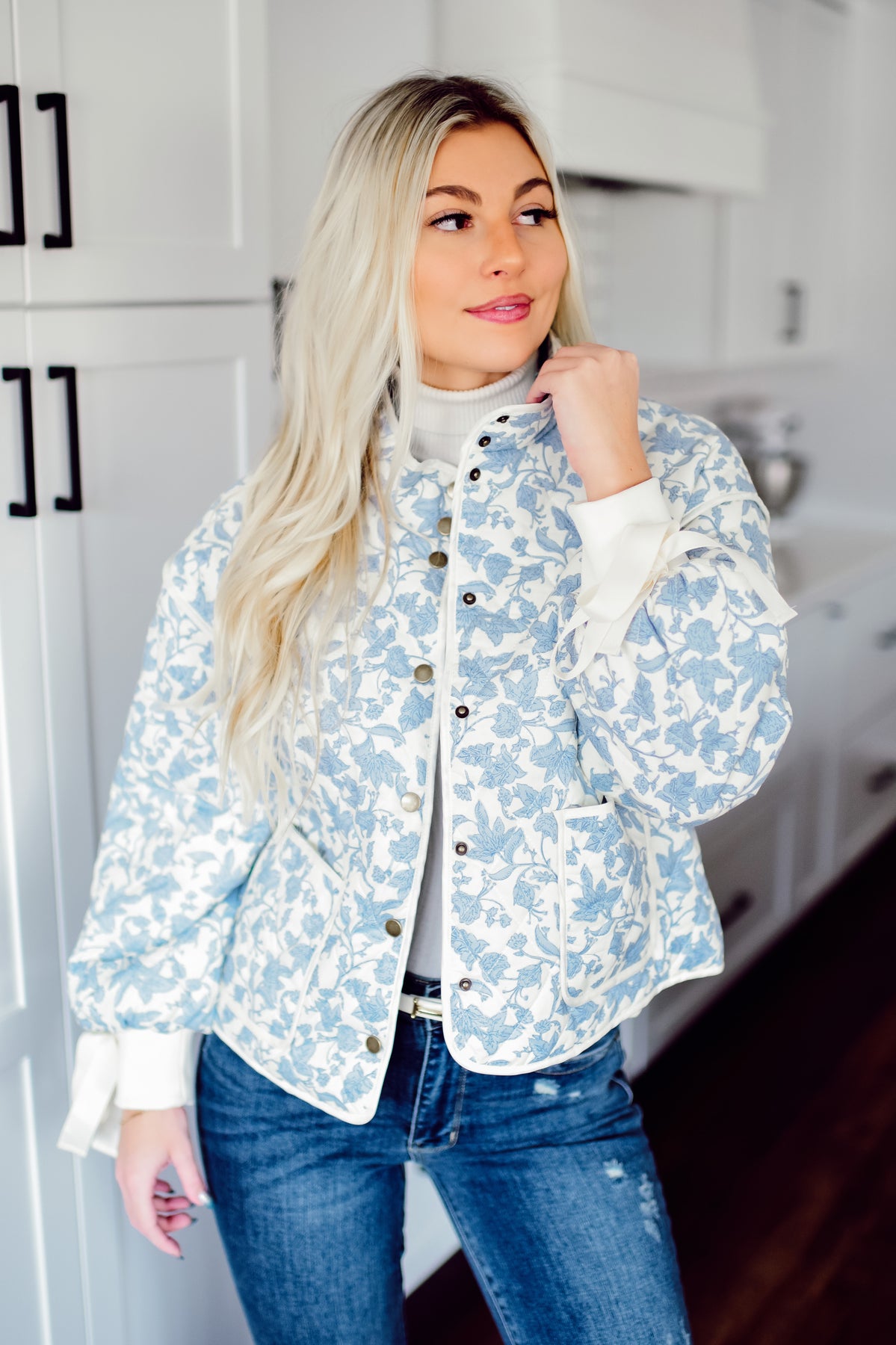 This quilted floral jacket is pure joy! Ivory and baby blue blooms pair beautifully with gold snap buttons, a charming stand collar, and precious ribbon bows on the balloon sleeves. Contrast piping details and relaxed drop shoulders complete the look. Layer it over anything for instant charm.