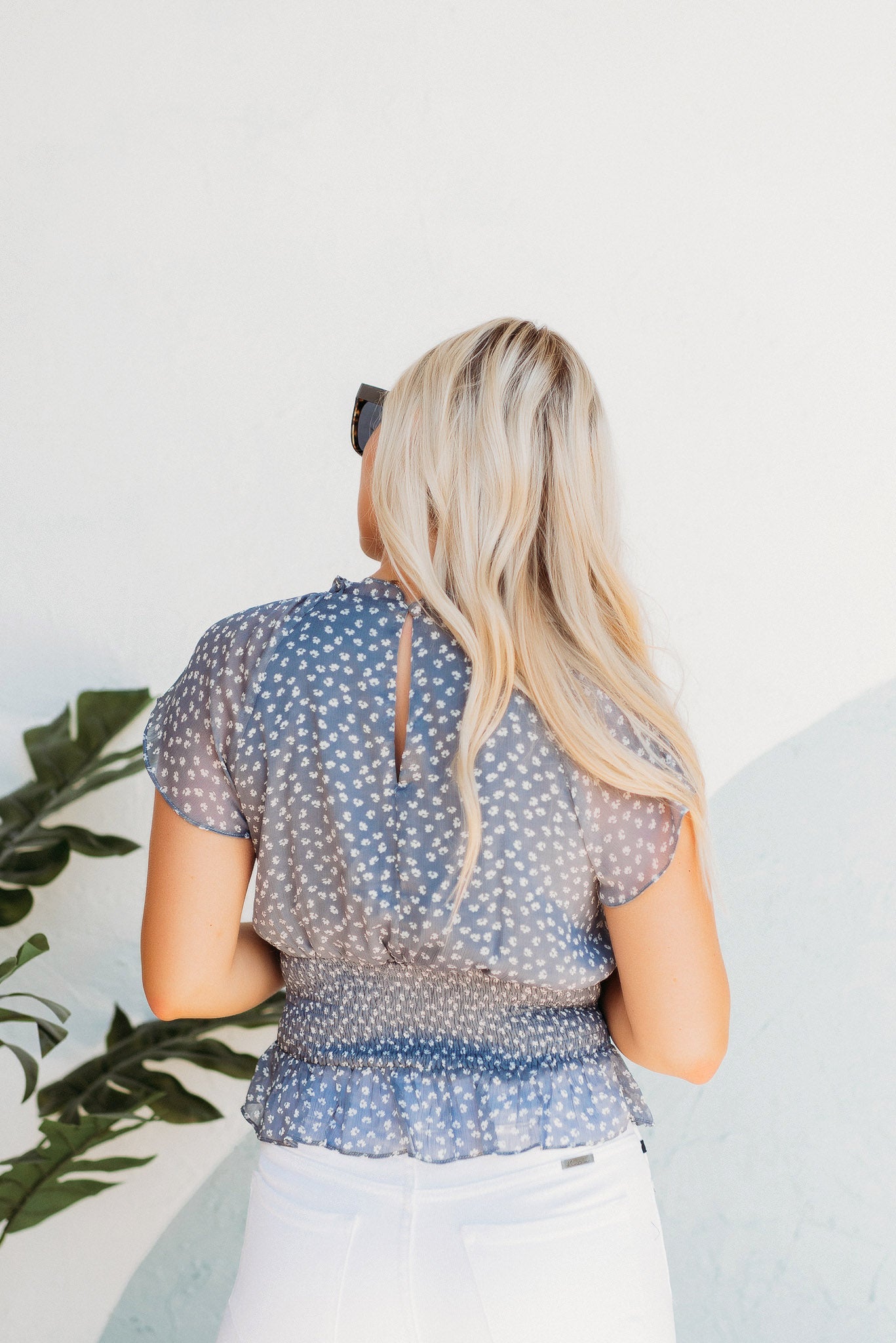 Adorable floral print blouse featuring short sheer bell sleeves, a double lined surplice bust with snap button closure, keyhole detail in back, and smocked detail at the lower bodice that creates mini ruffle detail at the hem!