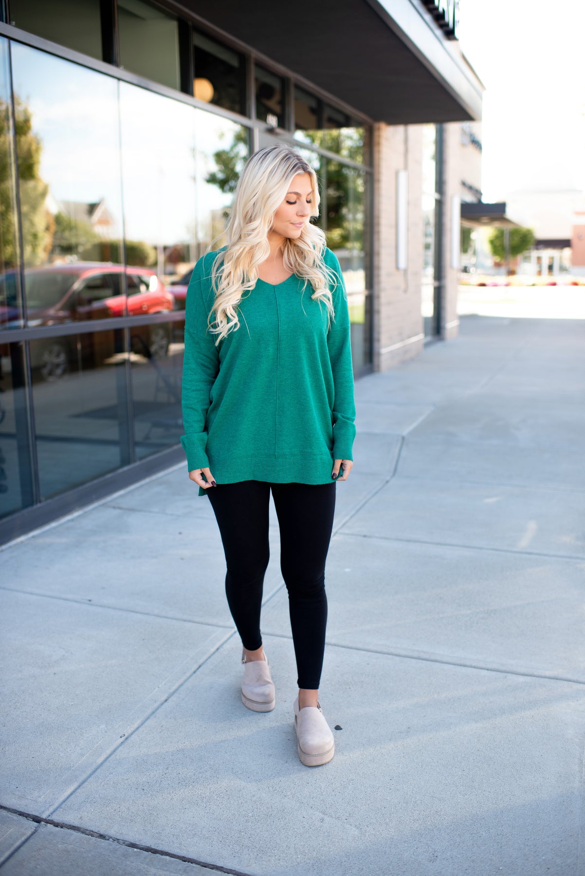 We are in love with this super soft tunic sweater made from a cashmere-like fabric! It is perfect for fall and features a slight v-cut neckline, relaxed fit, high-low bottom hemline, and ribbed detail around the sleeve cuffs and hemline! Pairs perfectly with leggings or denim, and layers well under a vest or blanket scarf! You will want one in every color!