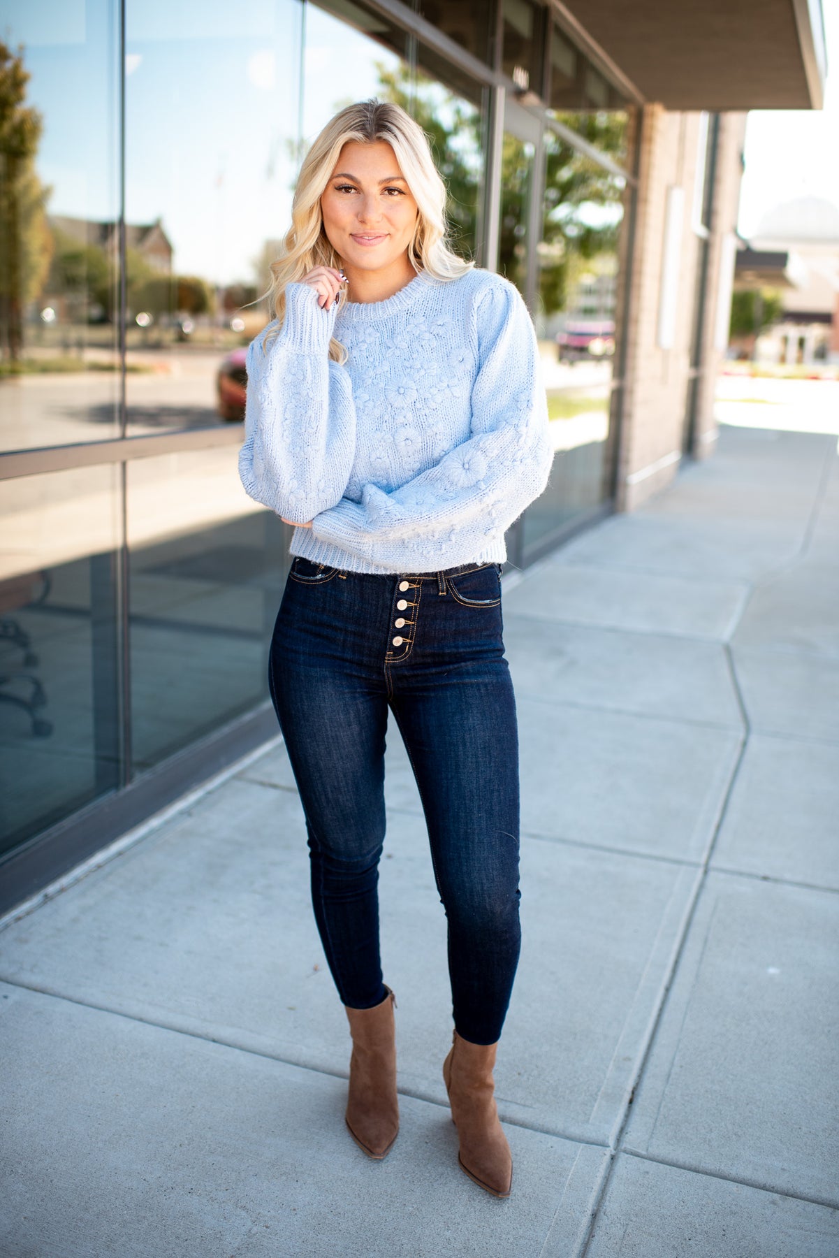 Cropped style sweater with floral embroidery details in the lightest sky blue color! Perfect for winter and taking it straight into spring.