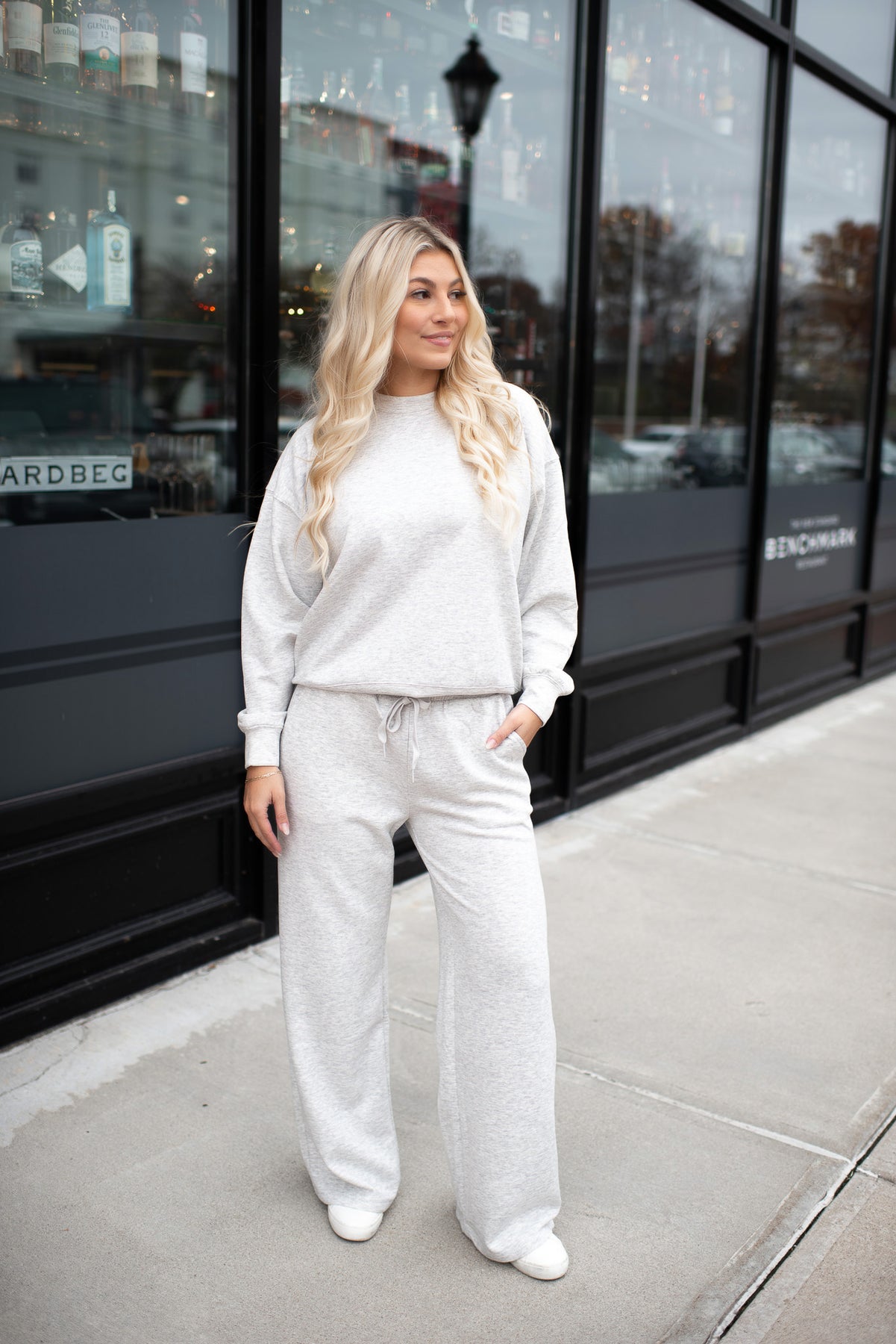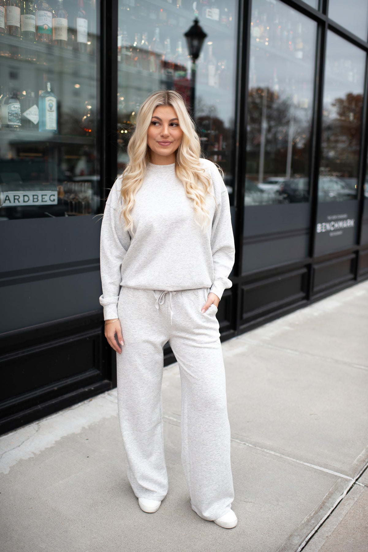 This cozy sweatsuit is what fall dreams are made of! Matching easy outfit for days on the go or just lounging around the house. Crewneck sweatshirt with matching straight sweatpants.