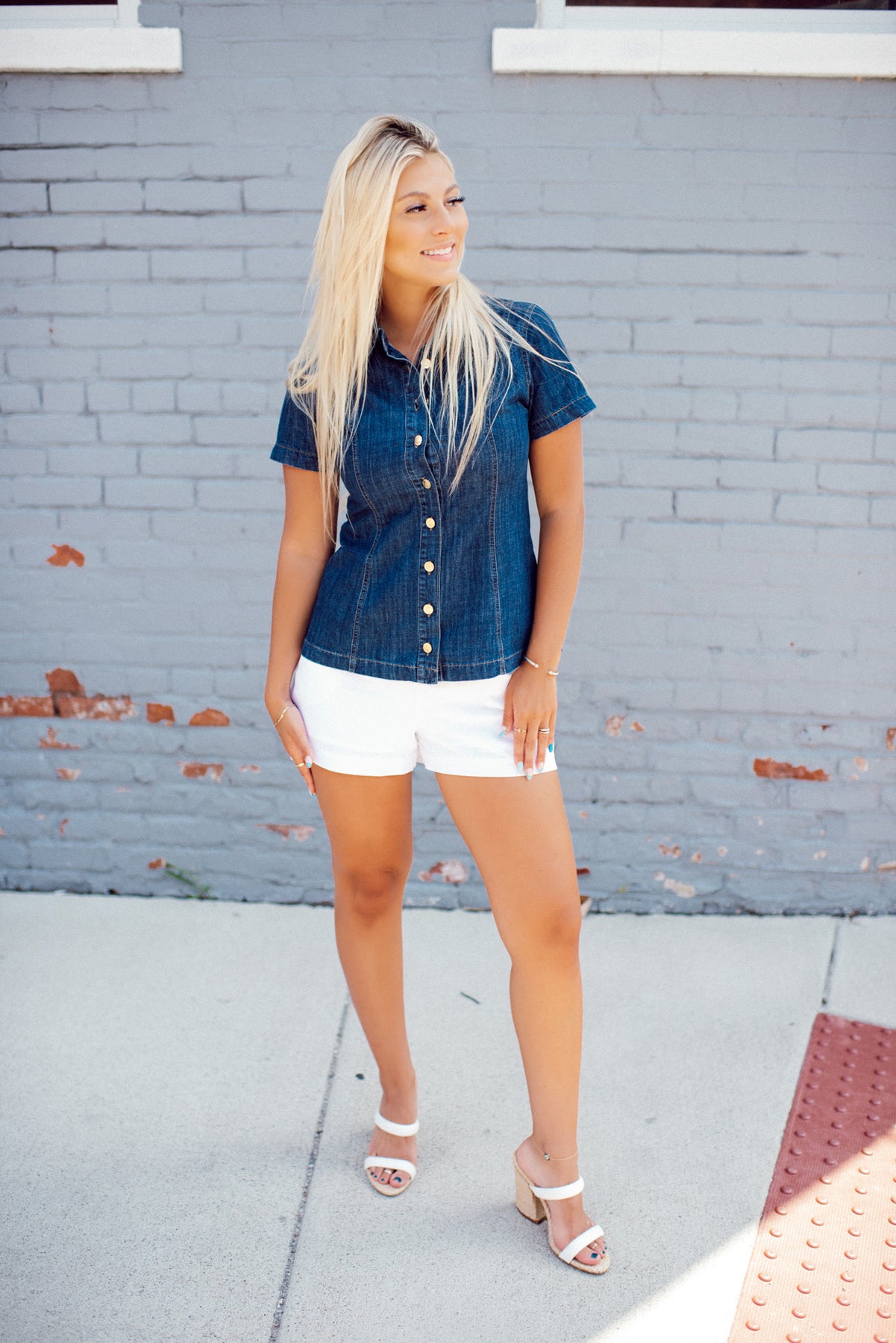 The Wexley Top (Denim) combines the laid-back look of denim with the softness of 100% cotton. With fun structural details, a crisp collar, and shiny gold buttons, it’s classic button-down. Plus, a slight stretch keeps you comfy and ready for anything!