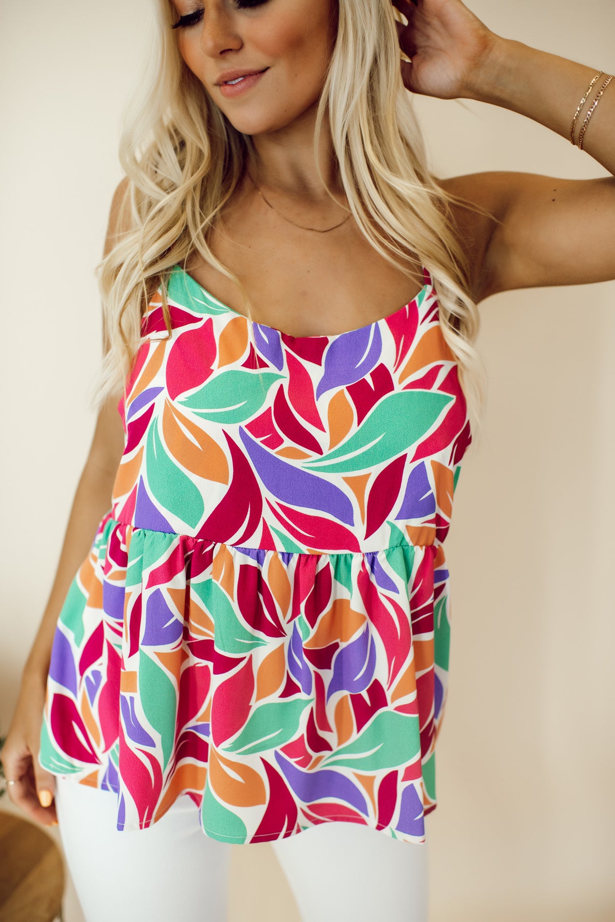 Make a sunny statement in our Palm Days Babydoll Tank! This peplum tank will give you a cool, breezy vibe with its bright & colorful leaf print and criss cross back. It's a must-have for any fun-loving fashionista -strapless bra recommended, but not required.